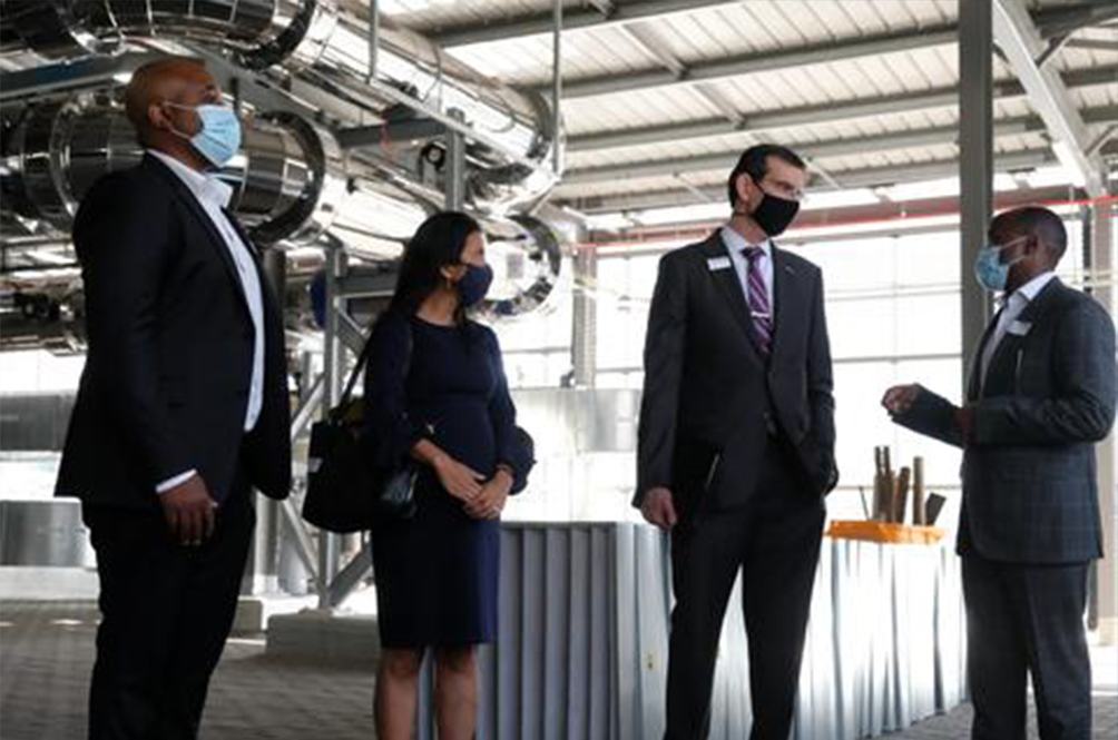 Hardy Pemhiwa, Cassava Technologies CEO, gives the DFC’s Regional MD for Africa, Vibhuti Jain, and US Consul General, Vincent Spera. a tour of a data center in Johannesburg.